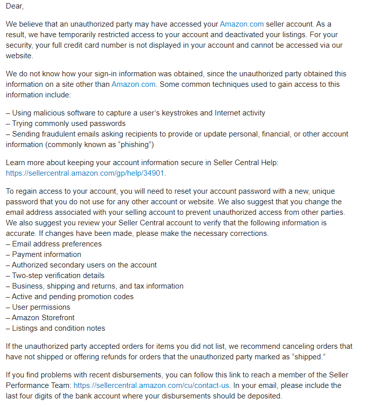 大概意思是:有人未经授权私自访问了该卖家的卖家账户,所以,亚马逊暂时限制了账户的访问并停用了列表,出于安全考虑,完整信用卡号不会显示在账户中,也无法通过亚马逊网站访问。